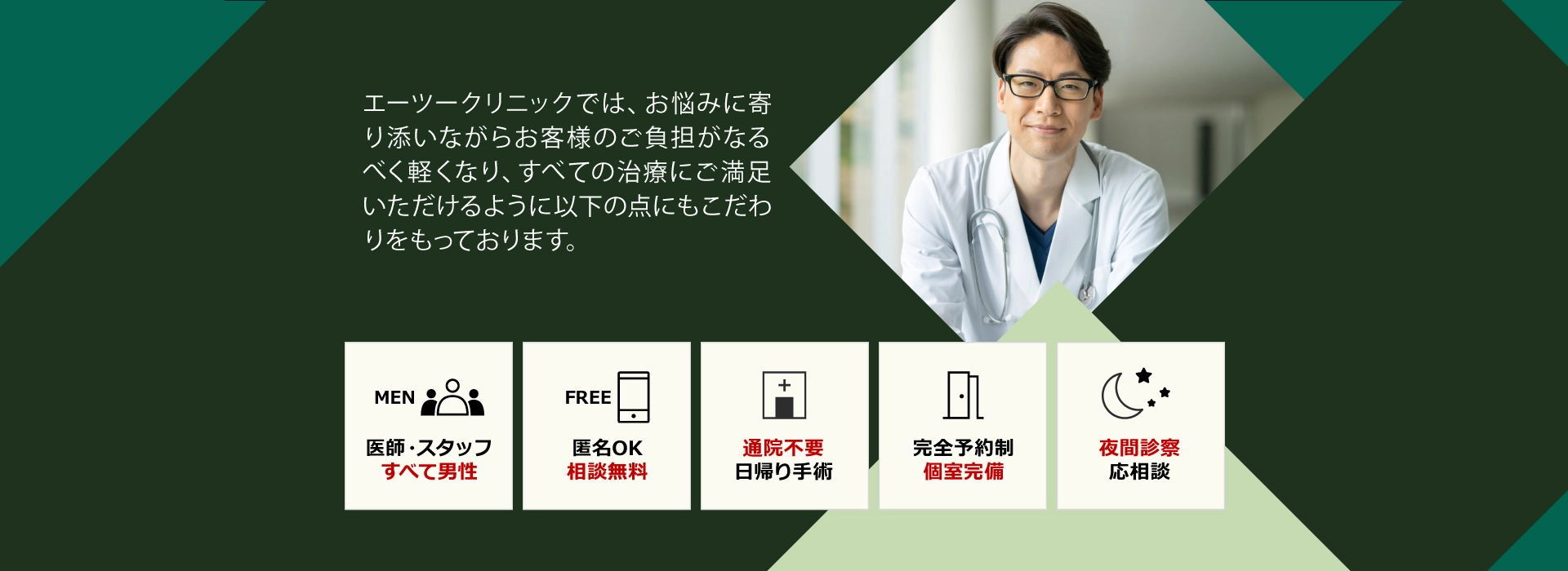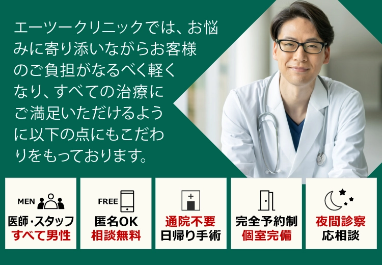 エーツークリニックは男性治療に特化したクリニックですので、医師やスタッフは全員が男性です。